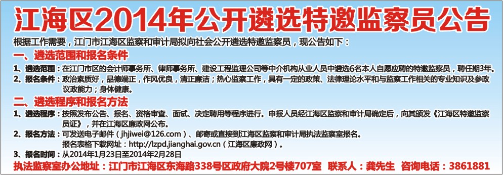 1、遴选范围:在江门市区的会计师事务所、律师事务所、建设工程监理公司等中介机构从业人员中遴选6名本人自愿应聘的特邀监察员,聘任期3年。