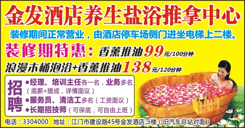 电话:3304000 地址:江门市建设路45号金发酒店二楼(旧汽车总站对面)