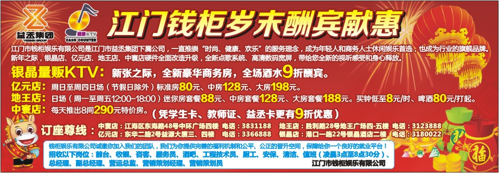 新年之际,银晶店、亿元店、地王店、中寰店硬件全面改造升级,全新点歌系统、高清数码宽屏,带给您全新的视听感受和身心释放。