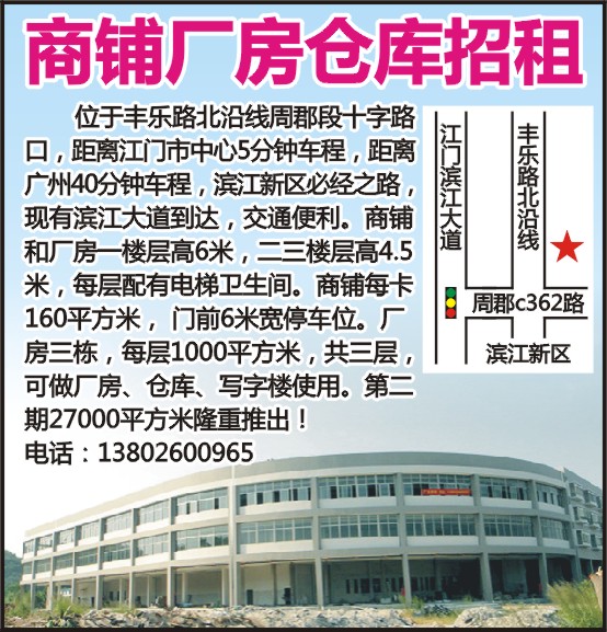 位于丰乐路北沿线周郡段十字路口,距离江门市中心5分钟车程,距离广州40分钟车程,滨江新区必经之路,现有滨江大道到达,交通便利。商铺和厂房一楼层高6米,二三楼层高4.5米,每层配有电梯卫生间。商铺每卡160平方米, 门前6米宽停车位。厂房三栋,每层1000平方米,共三层,可做厂房、仓库、写字楼使用。第二期27000平方米隆重推出!