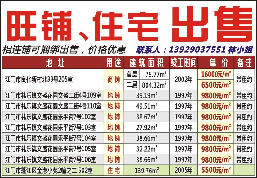 江门市礼乐镇文盛花园乐平街7号105室 地铺 32.22 1997 9800元/㎡ 带租约