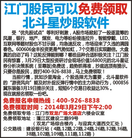受“优先股试点”等利好刺激,A股市场掀起了一股逐蓝筹的风潮,银行、地产、煤炭、电力等纷纷接连拉升,智能穿戴、LED、互联网等题材股也不甘示弱,均急速反攻,市场迎来了久违的满园春色。600606金丰投资更是气势如虹,7个交易日实现翻倍。大盘真的启动了吗?这轮反弹能到哪?哪些品种合适积极关注?江门股民有惊喜,3月29日大型投资研讨会现场价值16800元的北斗星证券分析决策系统(至尊版)免费送,趋势抓得准,抄底逃顶有提示。只要你是股民,拨打400-926-8838,马上免费领取!