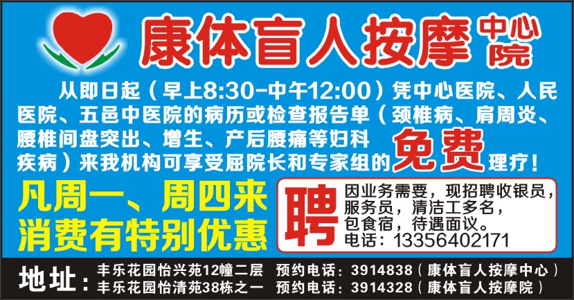 地址:丰乐花园怡清苑38栋之一 预约电话:3914328(康体盲人按摩院)