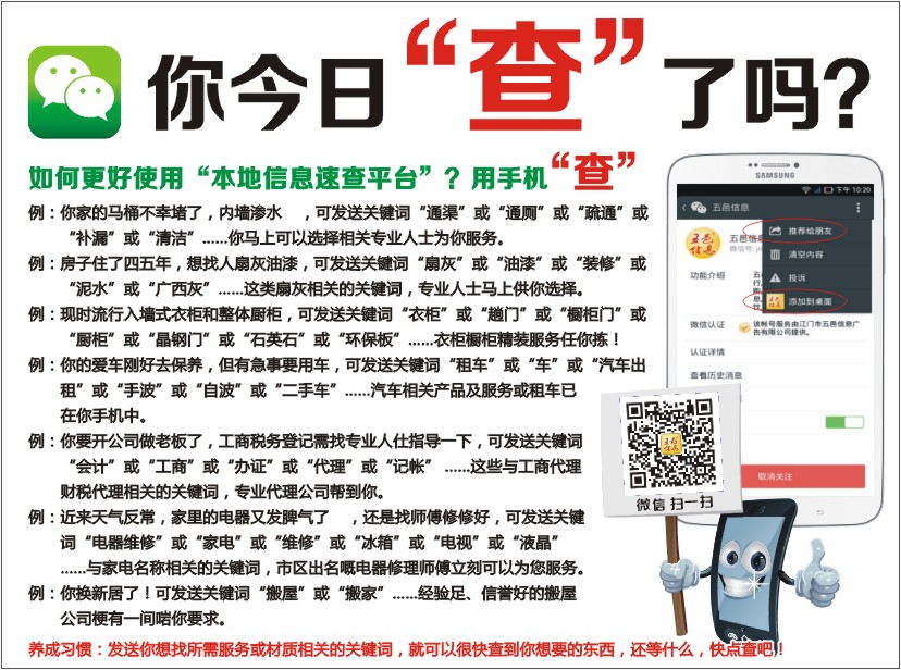 例:你家的马桶不幸堵了,内墙渗水 ,可发送关键词“通渠”或“通厕”或“疏通”或“补漏”或“清洁”……你马上可以选择相关专业人士为你服务。