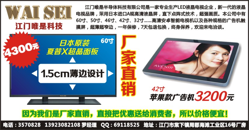 江门唯是半导体科技有限公司是一家专业生产LED液晶电视企业,新一代的液晶电视品牌,采用日本进口A规高清液晶屏,直下点阵式技术,超强画质。本公司中有60寸、50寸、46寸、42寸、32寸……高清安卓智能电视机以及各种规格的广告机触