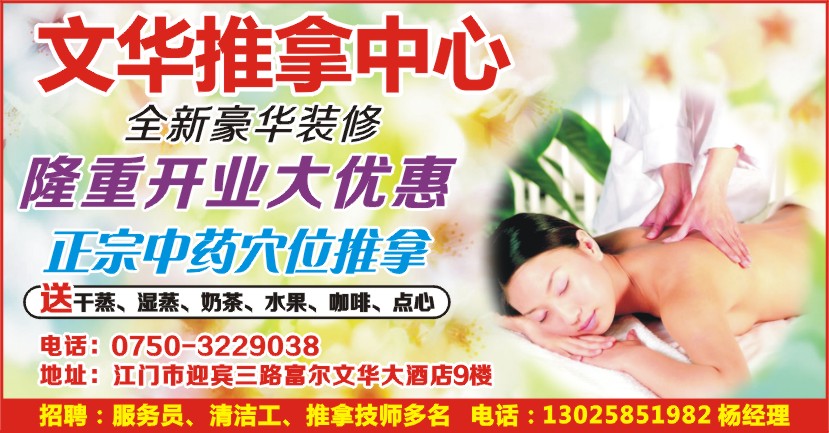 招聘:服务员、清洁工、推拿技师多名 电话:13025851982 杨经理