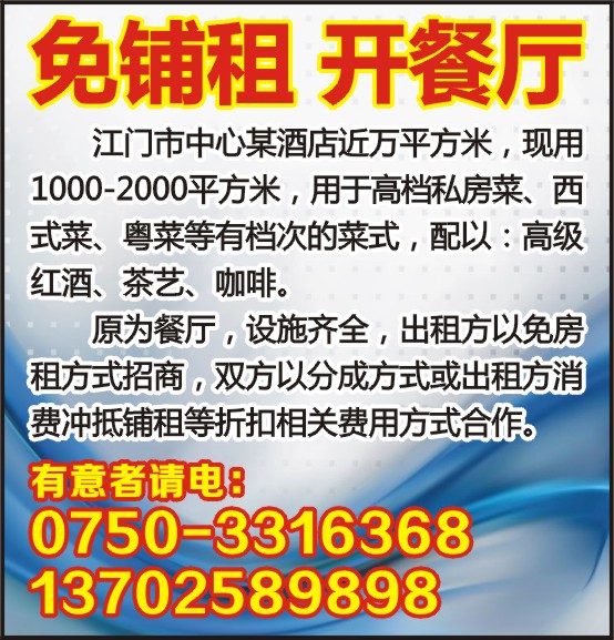 江门市中心某酒店近万平方米,现用1000-2000平方米,用于高档私房菜、西式菜、粤菜等有档次的菜式,配以:高级红酒、茶艺、咖啡。