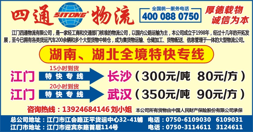 总公司地址:江门市江会路正平货运中心32-41铺 电话:0750-6109030 6109031