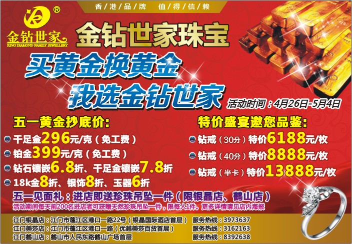 钻石镶嵌6.8折、千足金镶嵌7.8折