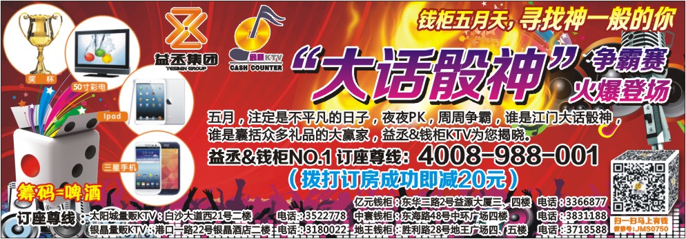 五月,注定是不平凡的日子,夜夜PK,周周争霸,谁是江门大话骰神,谁是囊括众多礼品的大赢家,益丞&钱柜KTV为您揭晓。