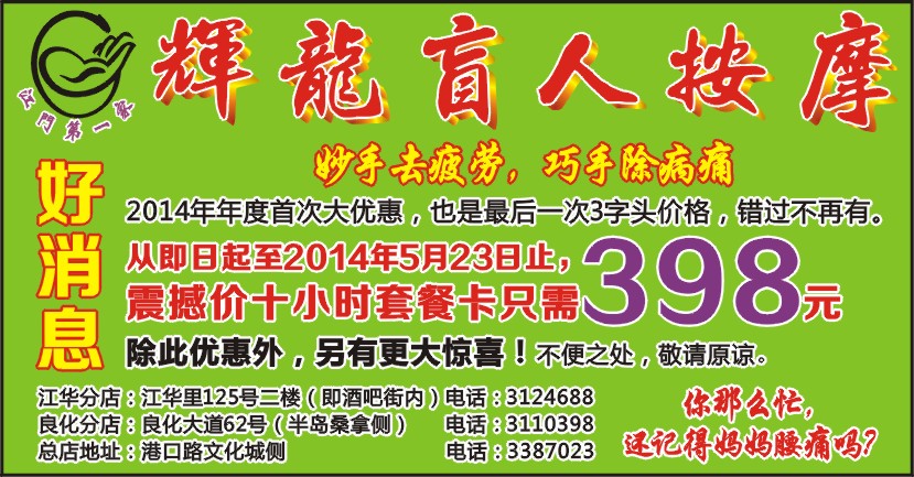 良化分店:良化大道62号(半岛桑拿侧) 电话:3110398