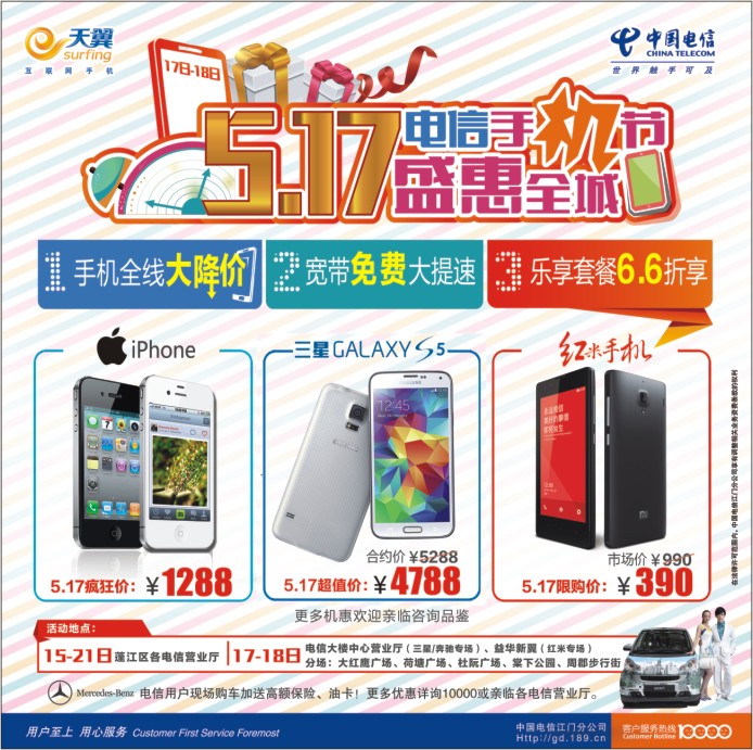 17-18日电信大楼中心营业厅(三星/奔驰专场)、益华新翼(红米专场)