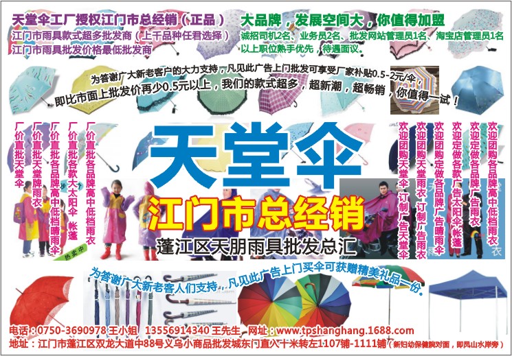为答谢广大新老客户的大力支持,凡见此广告上门批发可享受厂家补贴0.5-2元/伞,即比市面上批发价再少0.5元以上,我们的款式超多,超新潮,超畅销,你值得一试!