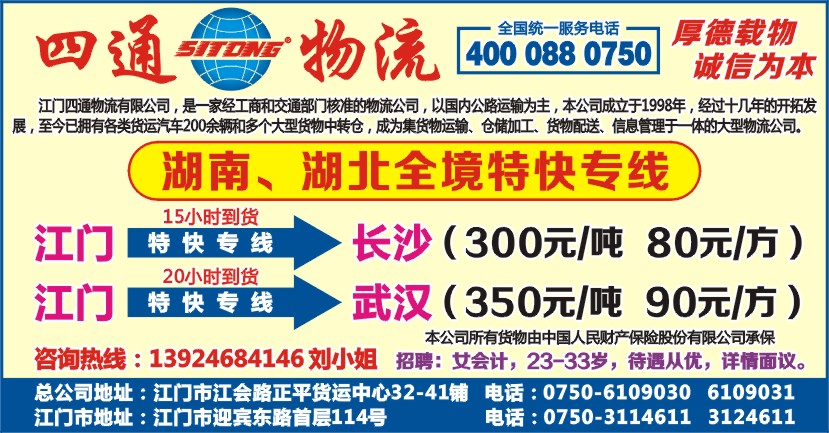 总公司地址:江门市江会路正平货运中心32-41铺 电话:0750-6109030 6109031