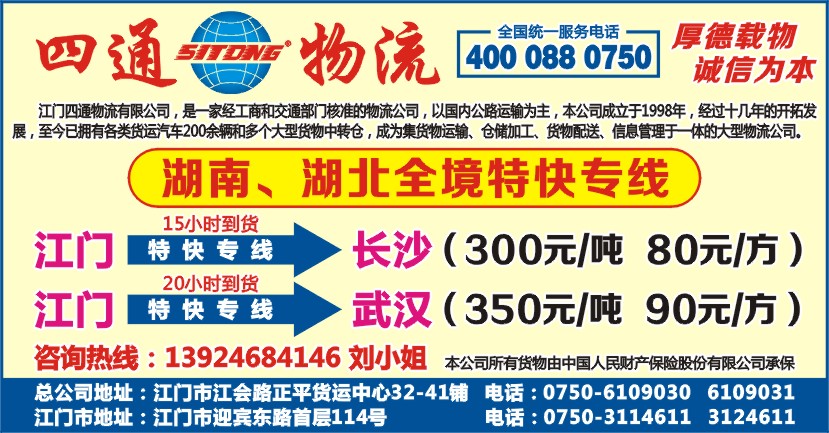 总公司地址:江门市江会路正平货运中心32-41铺 电话:0750-6109030 6109031