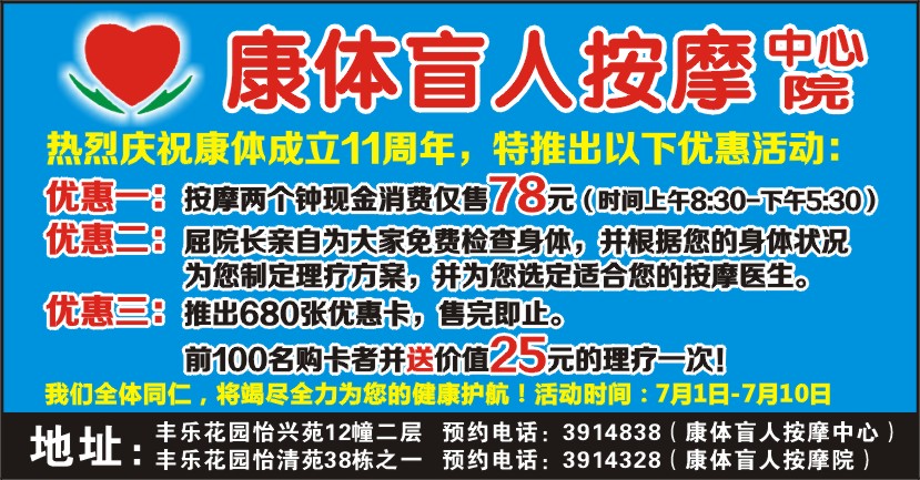 地址:丰乐花园怡清苑38栋之一 预约电话:3914328(康体盲人按摩院)