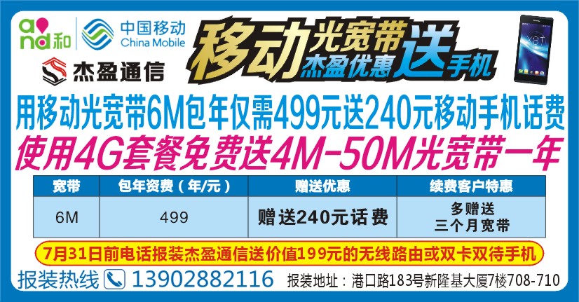 7月31日前电话报装杰盈通信送价值199元的无线路由或双卡双待手机