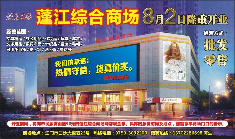 商场地点:江门市白沙大道西25号 热线电话:0750-3092200 招商热线:13702286698 何生