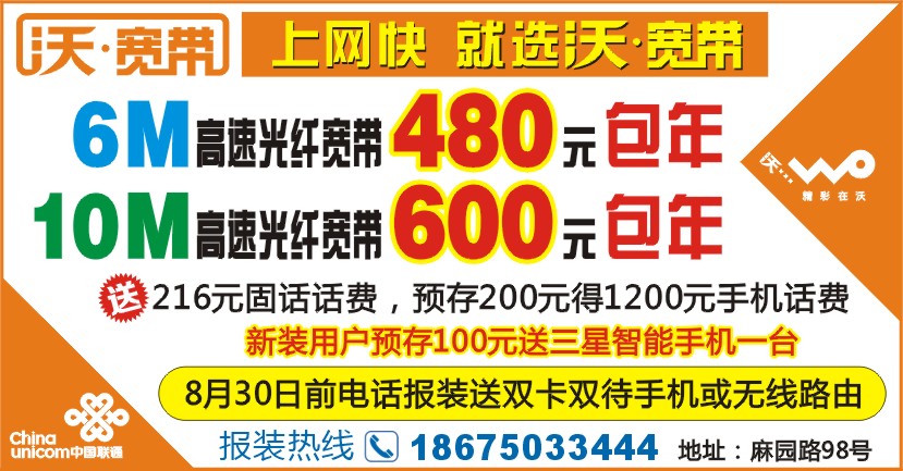 8月30日前电话报装送双卡双待手机或无线路由