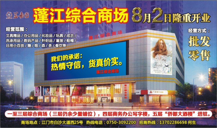 商场地点:江门市白沙大道西25号 热线电话:0750-3092200 招商热线:13702286698 何生