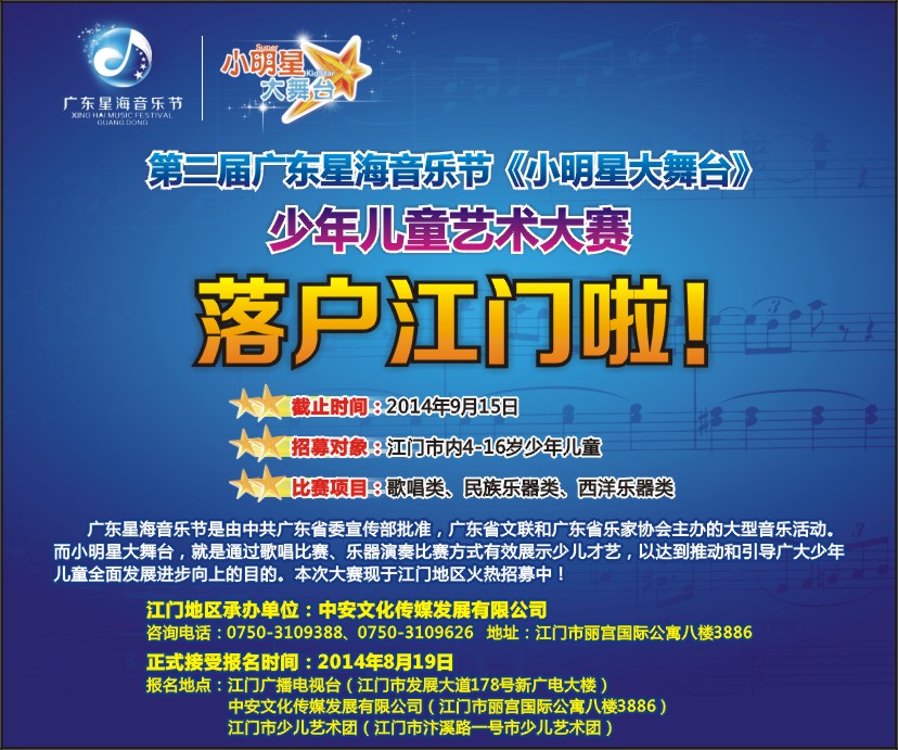 广东星海音乐节是由中共广东省委宣传部批准,广东省文联和广东省乐家协会主办的大型音乐活动。而小明星大舞台,就是通过歌唱比赛、乐器演奏比赛方式有效展示少儿才艺,以达到推动和引导广大少年儿童全面发展进步向上的目的。本次大赛现于江门地区火热招募中!