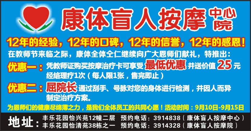 地址:丰乐花园怡清苑38栋之一 预约电话:3914328(康体盲人按摩院)