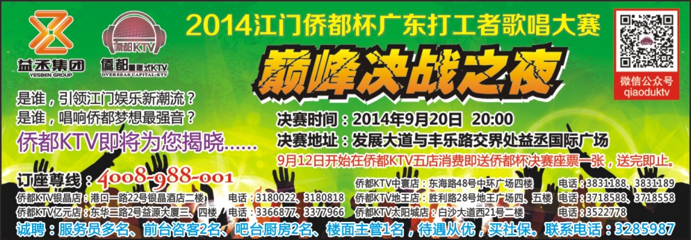 9月12日开始在侨都KTV五店消费即送侨都杯决赛座票一张,送完即止。