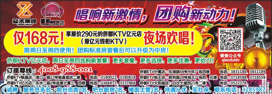 侨都KTV中寰店:东海路48号中环广场四楼 电话:3831188、3831189