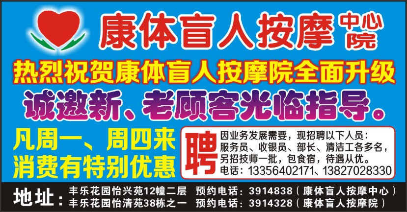 地址:丰乐花园怡清苑38栋之一 预约电话:3914328(康体盲人按摩院)