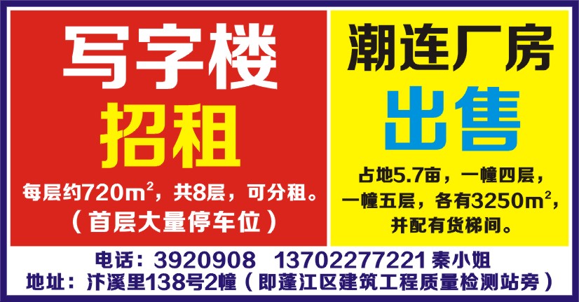 电话:3920908 13702277221 秦小姐 地址:汴溪里138号2幢(即蓬江区建筑工程质量检测站旁)