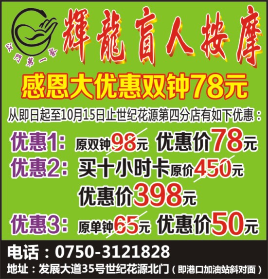 从即日起至10月15日止世纪花源第四分店有如下优惠: