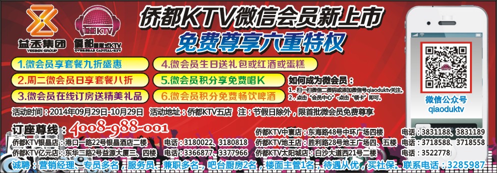 侨都KTV中寰店:东海路48号中环广场四楼 电话:3831188、3831189
