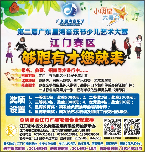 报名地点:江门广播电视台、中安文化传媒、市少儿艺术团、珠江琴行、侨爵琴行、星熙琴行、国雅文化艺术中心
