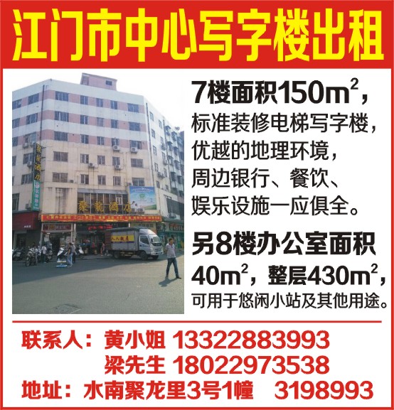 7楼面积150m2,标准装修电梯写字楼,优越的地理环境,周边银行、餐饮、娱乐设施一应俱全。 另8楼办公室面积40m2,整层430m2,可用于悠闲小站及其他用途。 联系人:黄小姐 13322883993 梁先生 18022973538 地址:水南聚龙里3号1幢 3198993