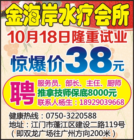 10月18日隆重试业 惊爆价38元 聘服务员、部长、主仼、厨师 推拿技师保底8000元 联系人杨生:18929039668 健康热线:0750-3220588 地址:江门市蓬江区建设二路119号 (即双龙广场往广州方向200米)