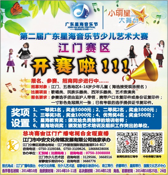 报名地点:江门广播电视台、中安文化传媒、市少儿艺术团、邬静音乐培训中心、珠江琴行、侨爵琴行、星熙琴行、国雅文化艺术中心