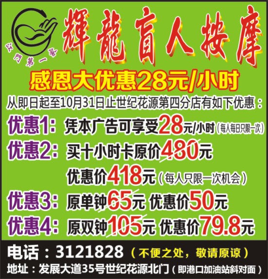 从即日起至10月31日止世纪花源第四分店有如下优惠: