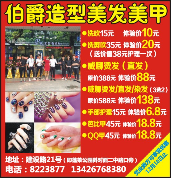 ●洗吹15元 体验价10元 ●洗剪吹35元 体验价20元 (送价值38元护理一次) ●威娜烫发(直发) 原价388元 体验价88元 ●威娜烫发/直发/染发(3选2) 原价588元 体验价138元 ●手部护理15元 体验价6.8元 ●芭比甲45元 体验价18.8元 ●QQ甲45元 体验价18.8元 凭此券方可享受优惠 12月15日止 地址:建设路21号(即蓬莱公园斜对面二中路口旁) 电话:8223877 13426768380