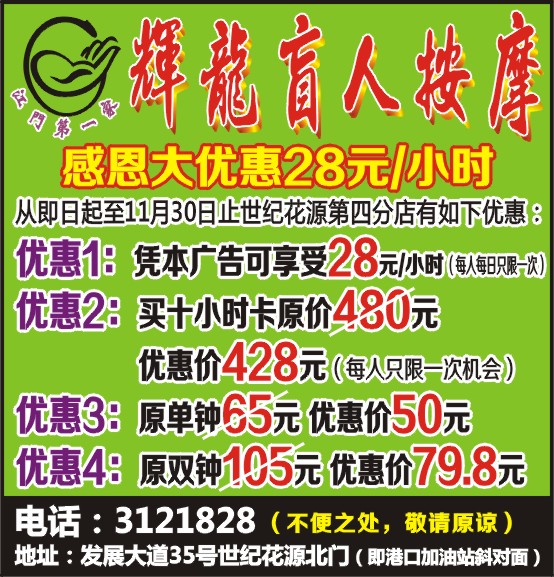 从即日起至11月30日止世纪花源第四分店有如下优惠: