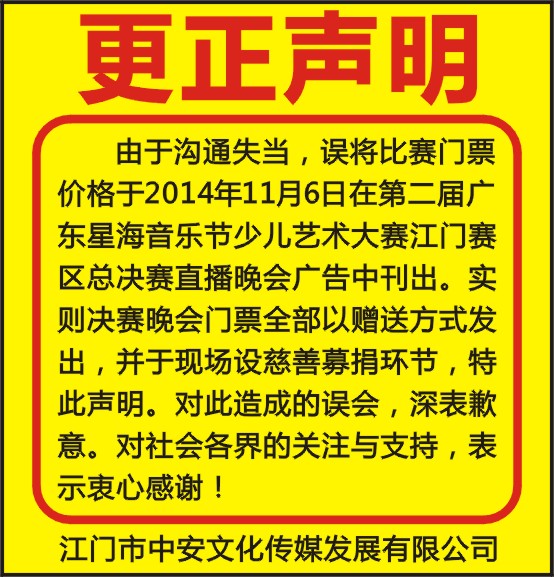 由于沟通失当,误将比赛门票价格于2014年11月6日在第二届广东星海音乐节少儿艺术大赛江门赛区总决赛直播晚会广告中刊出。实则决赛晚会门票全部以赠送方式发出,并于现场设慈善募捐环节,特此声明。对此造成的误会,深表歉意。对社会各界的关注与支持,表示衷心感谢!