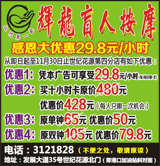 从即日起至11月30日止世纪花源第四分店有如下优惠: