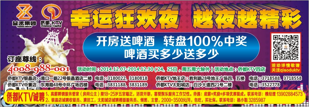 活动时间:2014.12.07-2014.12.30(24、25日,周五周六除外)活动地点:侨都KTV四店