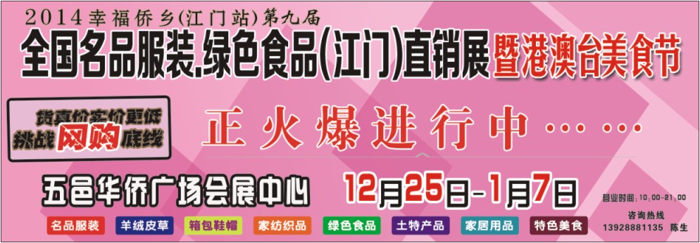 全国名品服装、绿色食品(江门站)直销展暨港澳台美食节隆重登陆江门华侨广场会展中心(活动时间12月25日-1月7日)