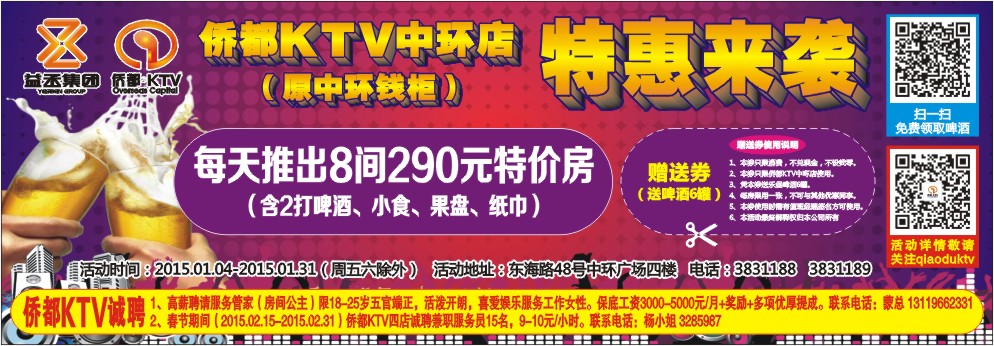 2、春节期间(2015.02.15-2015.02.31)侨都KTV四店诚聘兼职服务员15名,9-10元/小时。联系电话:杨小姐 3285987