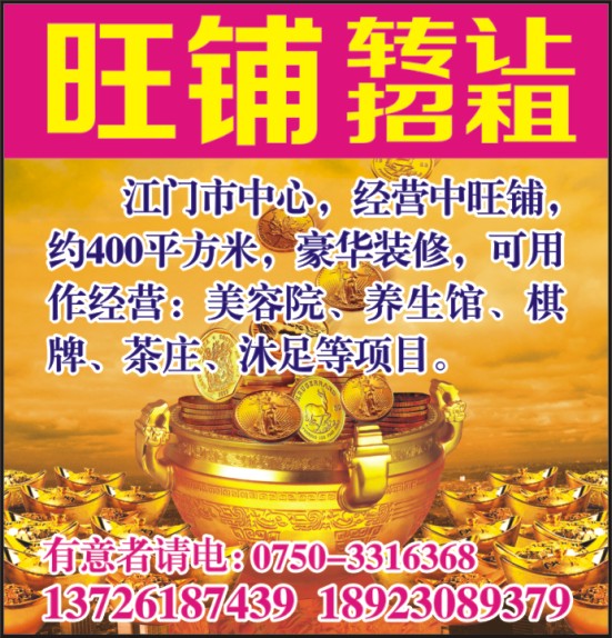 江门市中心,经营中旺铺,约400平方米,豪华装修,可用作经营:美容院、养生馆、棋牌、茶庄、沐足等项目。