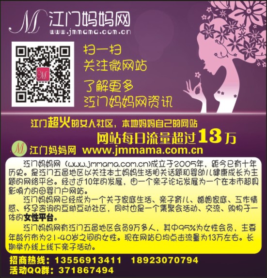 江门妈妈网有江门五邑地区会员9万多人,其中95%为女性会员,主要年龄分布为21-40岁之间的女性。现在网站日均点击流量为13万左右。长期举办线上线下亲子活动。