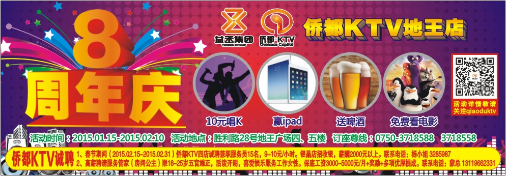 10元唱K 赢ipad 送啤酒 免费看电影 活动时间:2015.01.15-2015.02.10 活动地点:胜利路28号地王广场四、五楼 订座尊线:0750-3718588 3718558 侨都KTV诚聘 1、春节期间(2015.02.15-2015.02.31)侨都KTV四店诚聘兼职服务员15名,9-10元/小时。银晶店招收银,薪酬2000元以上。联系电话:杨小姐 3285987 2、高薪聘请服务管家(房间公主)限18-25岁五官端正,活泼开朗,喜爱娱乐服务工作女性。保底工资3000-5000元/月+奖励+多项优厚提成。联系电话:蒙总 13119662331