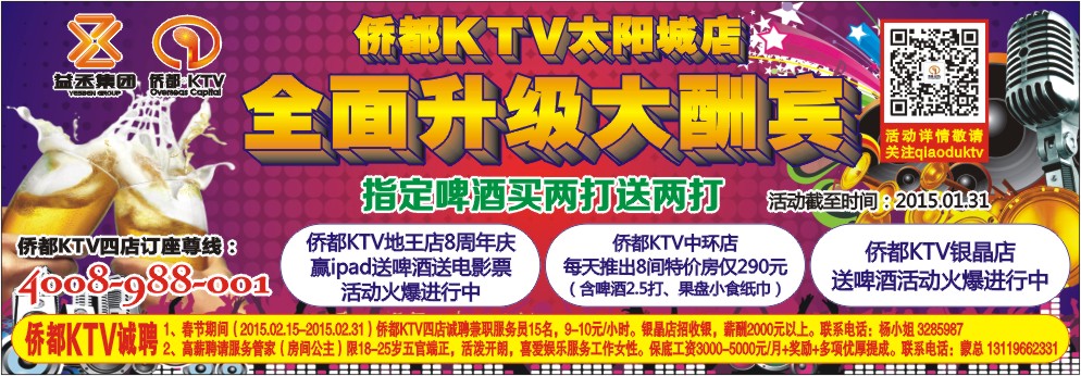 1、春节期间(2015.02.15-2015.02.31)侨都KTV四店诚聘兼职服务员15名,9-10元/小时。银晶店招收银,薪酬2000元以上。联系电话:杨小姐 3285987