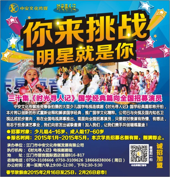 中安文化传媒独资筹备拍摄的大型少儿国学电视连续剧《时光寻人记》国学经典篇即将开拍,本片将以创新的形式重新诠释和解读国学经典,推广国学文化精粹。公司已与央视及国内知名卫视达成初步意向,将在全国电视屏幕推出。现面向全国招募演员,只要您对表演有热情、有想法,有志于投身演艺事业,我们向您发出诚挚邀请!加入我们,让我们携手共创璀璨星途!