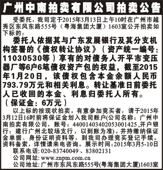 以上标的按现状拍卖。有意参加竞买者,请于2015年3月12日16时前将保证金划入我司帐户(公司名称:广州中南拍卖有限公司,帐号:44001403402053001425,开户银行:建行广州北较场支行,以到帐为准),并持缴纳保证金单据、身份证明资料等,到我司办理竞买登记手续。资料备索,详情请来电咨询。展示时间:2015年3月5-10日